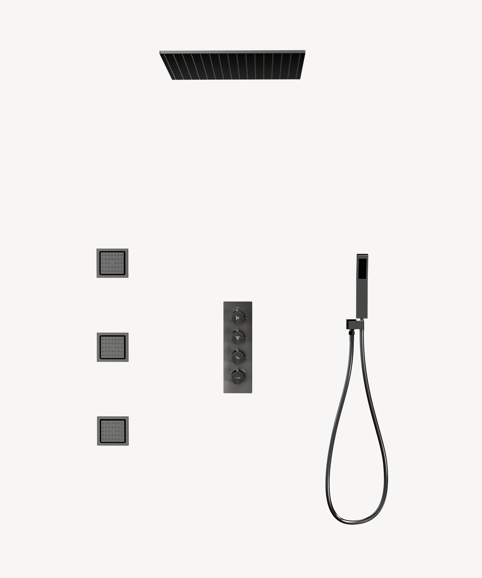 Tre manopole aggiuntive si dedicano in maniera specifica all’attivazione dei diversi punti d’acqua: pioggia, doccetta a mano oppure getti laterali. Ogni funzione viene identificata con pittogrammi chiari che guidano naturalmente l’utilizzatore, permettendo un uso immediato ed ergonomico. L’attenzione all’usabilità pone così l’esperienza al centro, favorendo praticità e semplicità in ogni gesto.