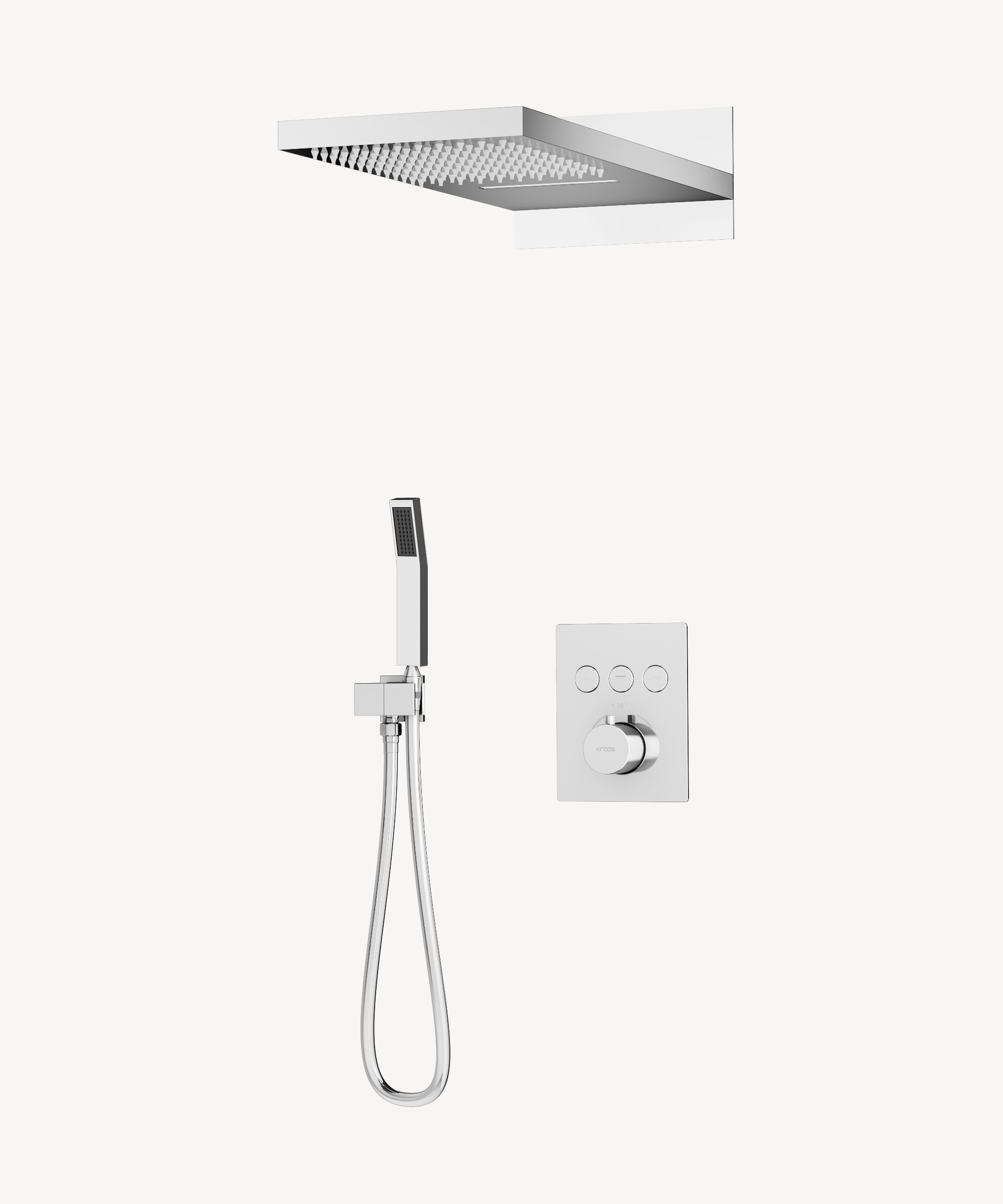 Un’ergonomia studiata contraddistingue il modello, con la presenza di 3 pulsanti distinti che consentono la selezione immediata tra la doccetta, la pioggia avvolgente del soffione e il getto a cascata, rivelando un’esperienza sensoriale ricca e personalizzabile. Le linee essenziali dell’elemento incassato rafforzano il valore estetico di una composizione raffinata, resa unica dalla delicatezza dell’effetto cascata.