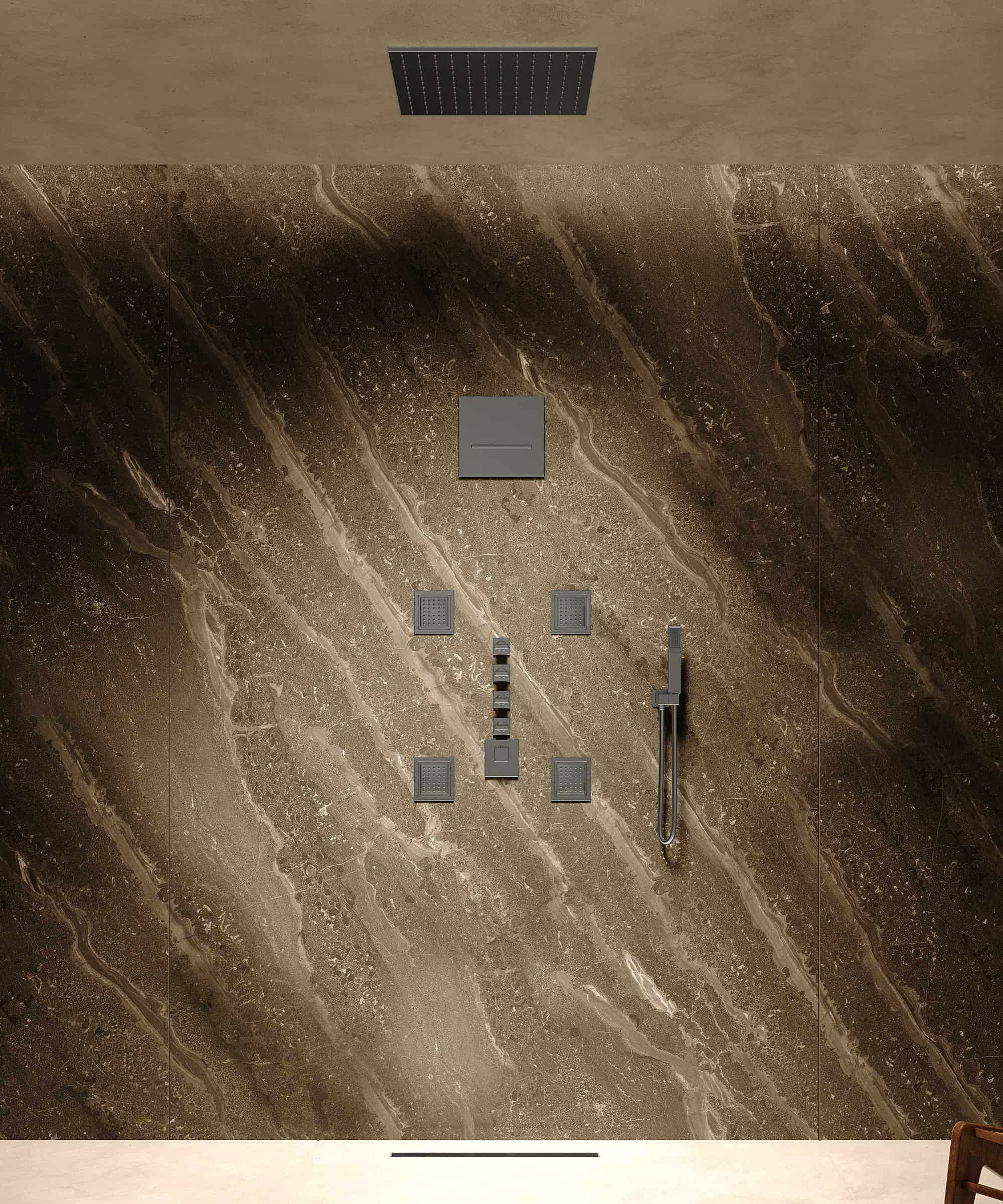 L’architettura della doccia si distingue per la molteplicità dei punti d’erogazione e per la regolazione precisa della temperatura, consentendo così un’esperienza personale e coinvolgente: