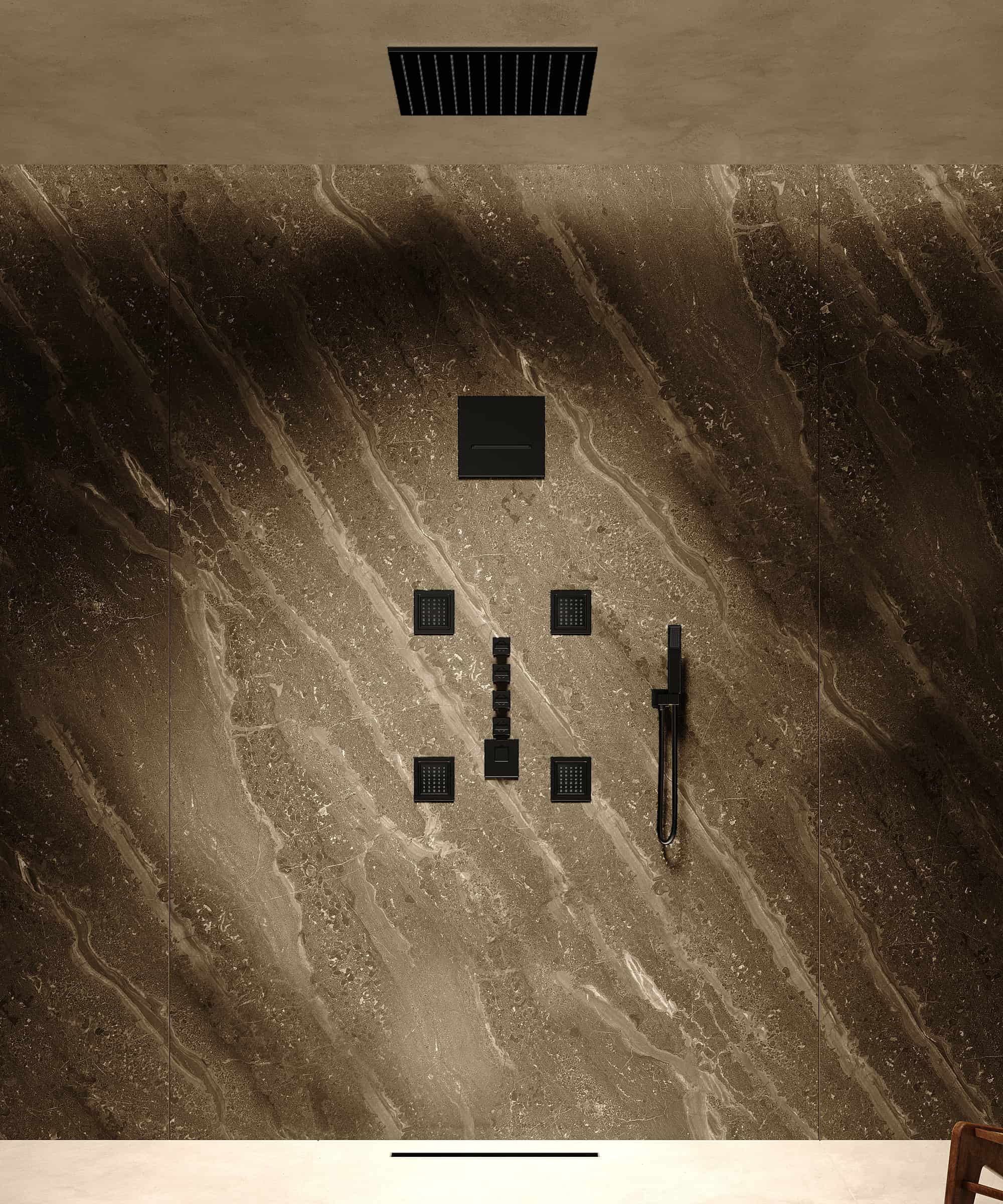 La coerenza formale del design, esaltata dalla prestigiosa finitura Noir opaca, consente alla composizione Sirius di andare ben oltre la semplice funzionalità tecnica. Gli elementi – cielo di pioggia, cascata a parete, jet corporei e doccetta a mano – dialogano armonicamente per creare un’atmosfera di assoluto relax, sofisticata, immersiva e in sintonia con le più attuali tendenze dell’interior design bagno.