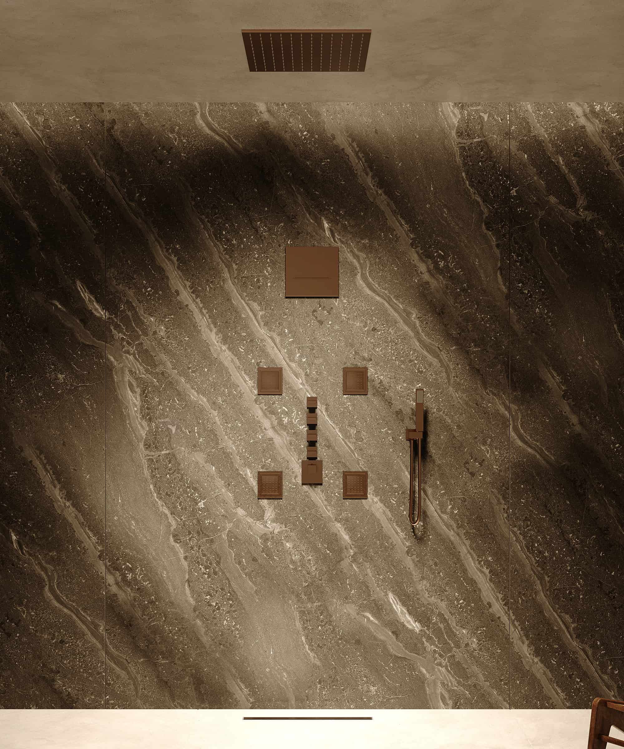 Questo sistema si distingue come sintesi impeccabile di design, funzionalità e benessere: la sinergia tra cielo di pioggia, cascata murale, body jets e doccetta a mano plasma un’atmosfera di relax assoluto. L’esclusiva finizione oro rosa spazzolato impreziosisce ogni attimo trascorso sotto la doccia, elevandolo a puro momento di benessere, espressione autentica di un’arte del vivere orientata alla raffinatezza.