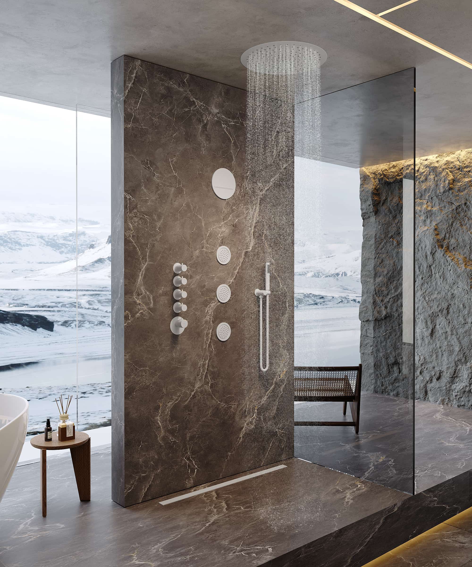 Il soffione a pioggia integrato a soffitto avvolge il corpo con una dolce cascata d’acqua, ideale per un profondo rituale di rigenerazione a ogni utilizzo.