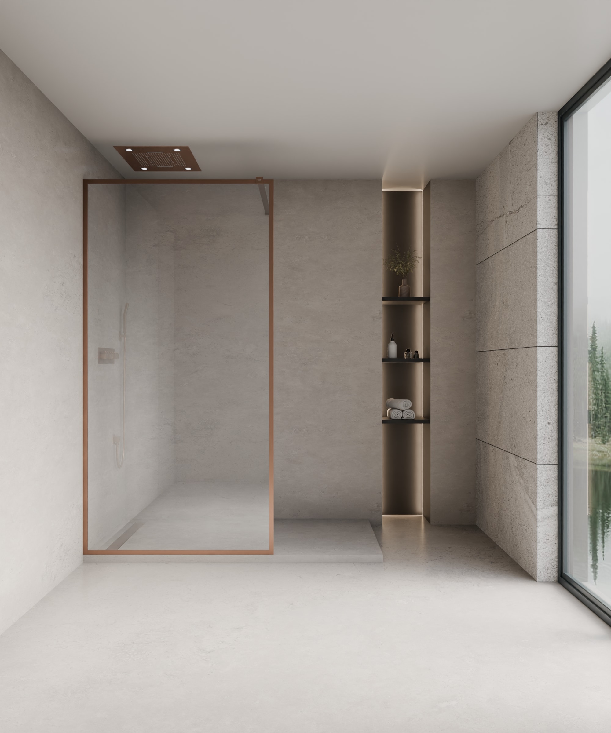 Questa parete doccia oro rosa spazzolato in vetro temperato trasparente e cornice in acciaio inox, offre qualità superiore. La finitura PVD garantisce altissima resistenza all'usura quotidiana.