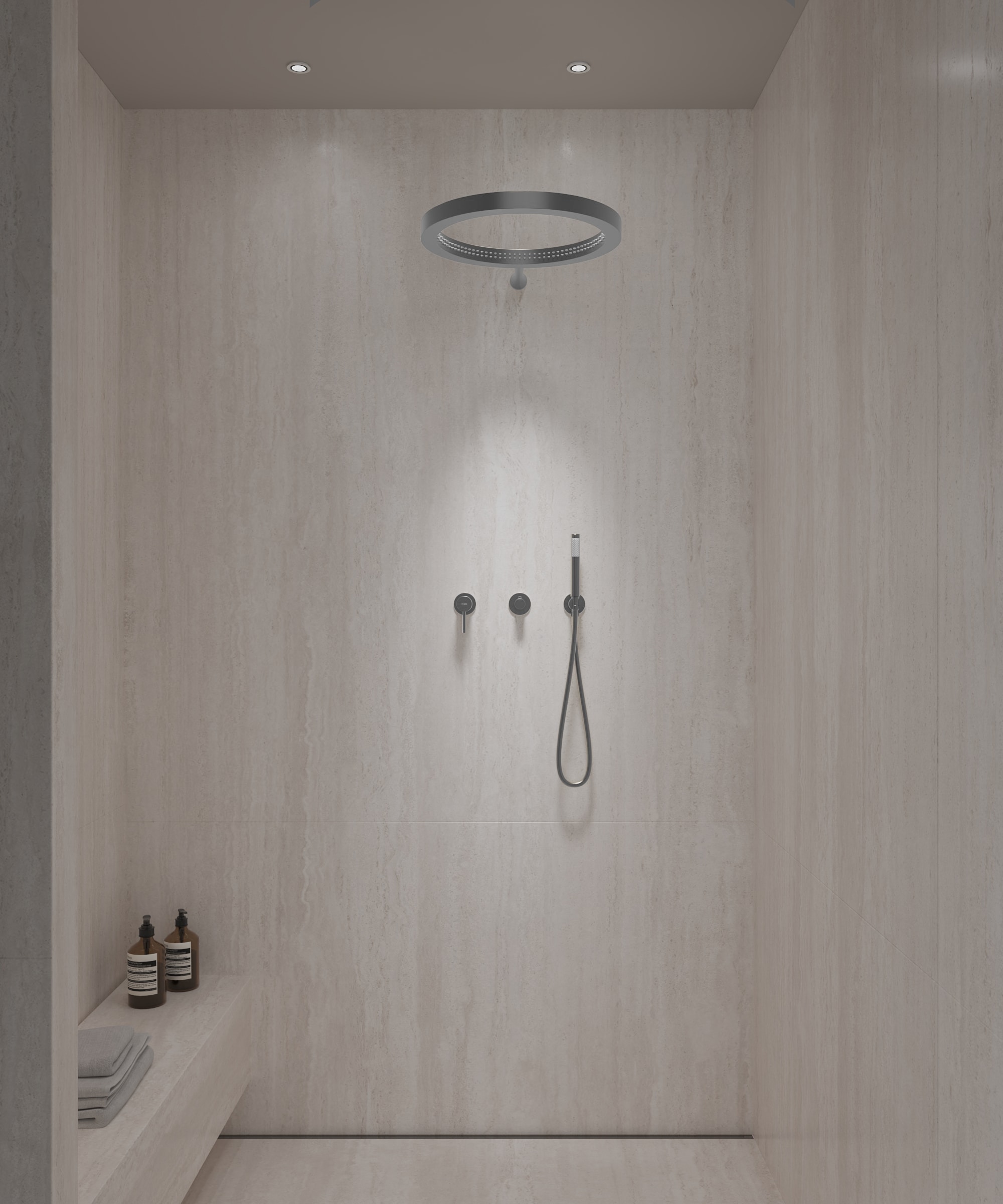 L’identità visiva del soffione si distingue attraverso una silhouette sospesa, delicata e leggera, che smorza la percezione di mera funzionalità per instaurare un ambiente votato al relax assoluto. L’acqua scorre in modo regolare, generando un effetto pioggia immersivo e profondamente rilassante, l’ideale per sciogliere le tensioni accumulate durante la giornata.