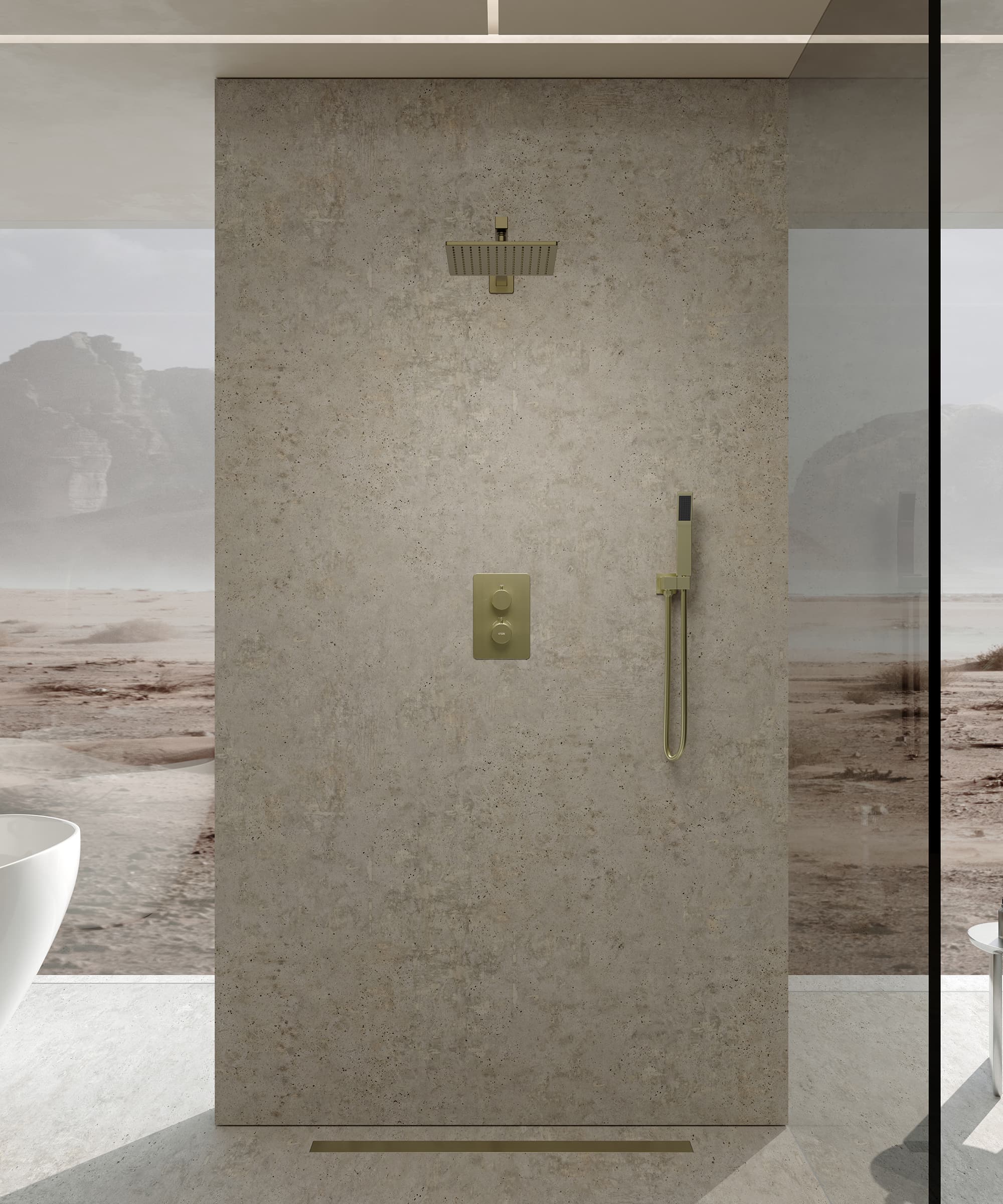 È dotato di un soffione quadrato che eroga un getto generoso e avvolgente e di una doccetta extrapiatta progettata per una presa comoda e un risciacquo preciso. Il soffione è completato da un piatto rettangolare sobrio ed elegante con due maniglie. La prima permette di controllare la temperatura dell'acqua senza alcuna variazione, garantendo una doccia sicura e sempre piacevole. La seconda maniglia è ildeviatore a due vie, che permette di passare facilmente dal soffione alla doccetta.
