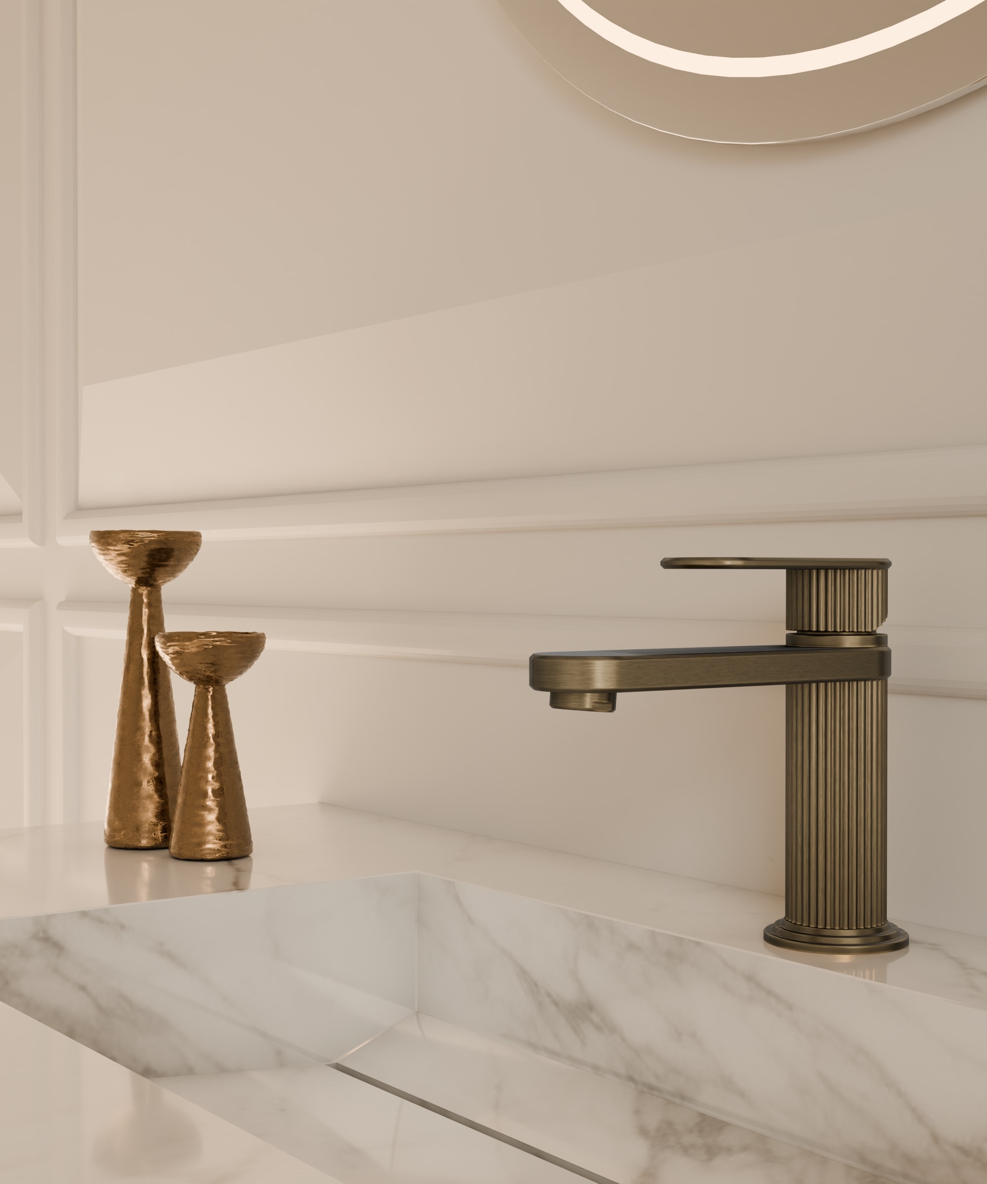 Con le sue linee eleganti e la finitura dorata spazzolata, la collezione Hera offre la libertà di creare una sala da bagno unica e ricca di personalità!