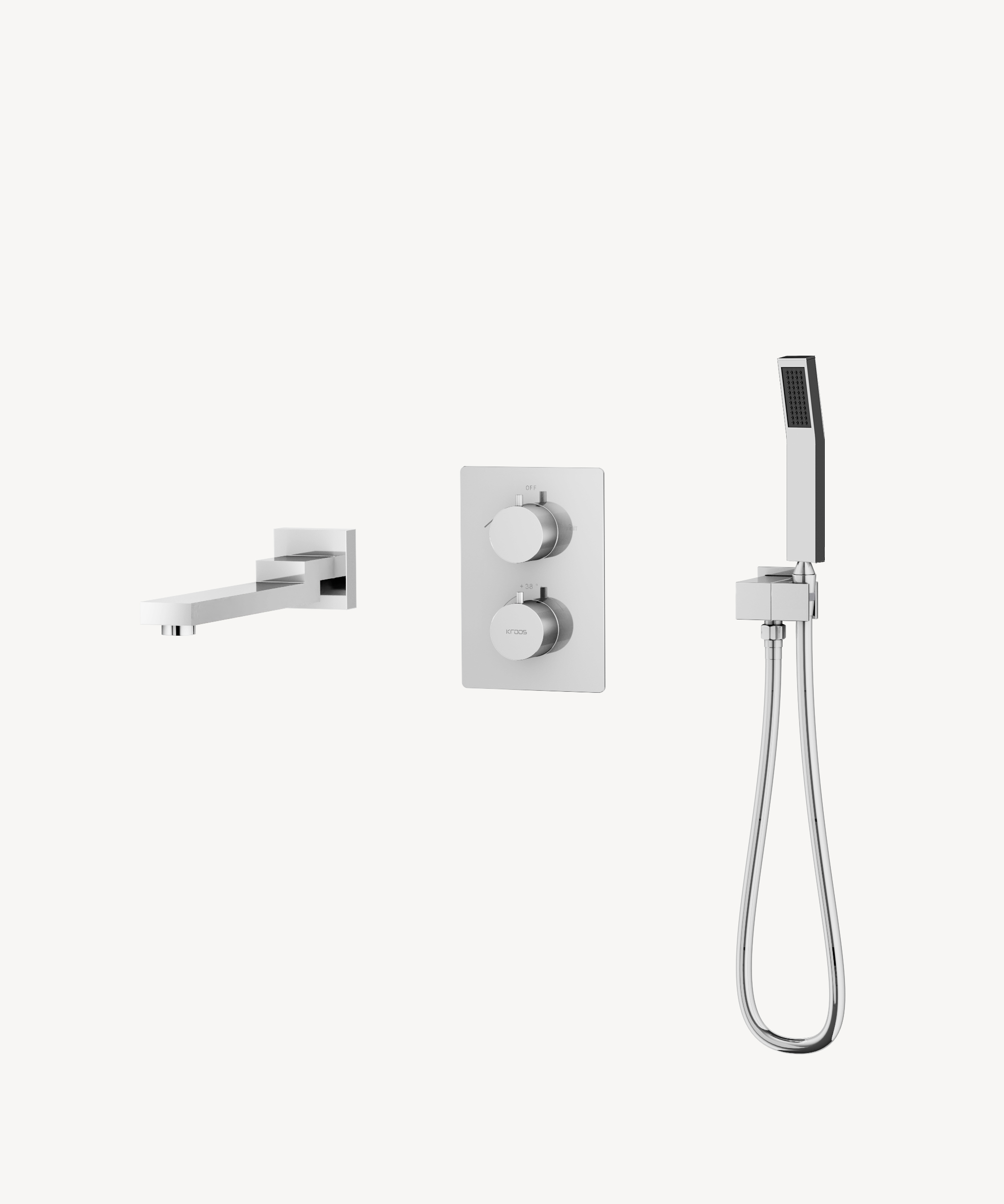 L’identità del set prende forza dall’equilibrio tra tre elementi sapientemente coordinati: il beccuccio riempivasca a muro dal profilo raffinato, la doccetta extrapiatta completa di supporto abbinato e la placca decorativa, vero elemento firmato, dotata di due comandi ergonomici. Il primo selettore consente la regolazione precisa di portata e temperatura, offrendo comfort costante e sicurezza d’uso. Il secondo permette una transizione intuitiva tra il becco e la doccetta, garantendo un’esperienza personalizzata pensata per accogliere ogni esigenza di relax.