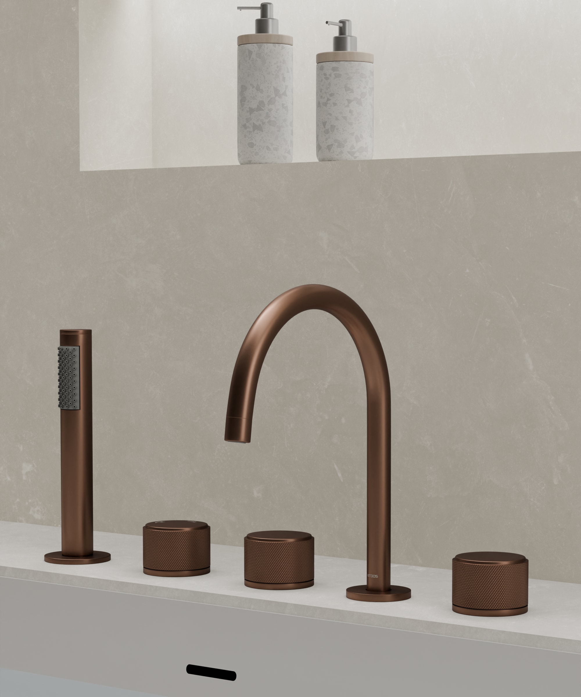 Il becco slanciato e arrotondato dona leggerezza al set, mentre le due maniglie texturizzate, segno distintivo della collezione Leros, permettono regolazioni di temperatura precise. L’invertitore facilita il passaggio da becco a doccetta. L’equilibrio perfetto tra stile e funzionalità.