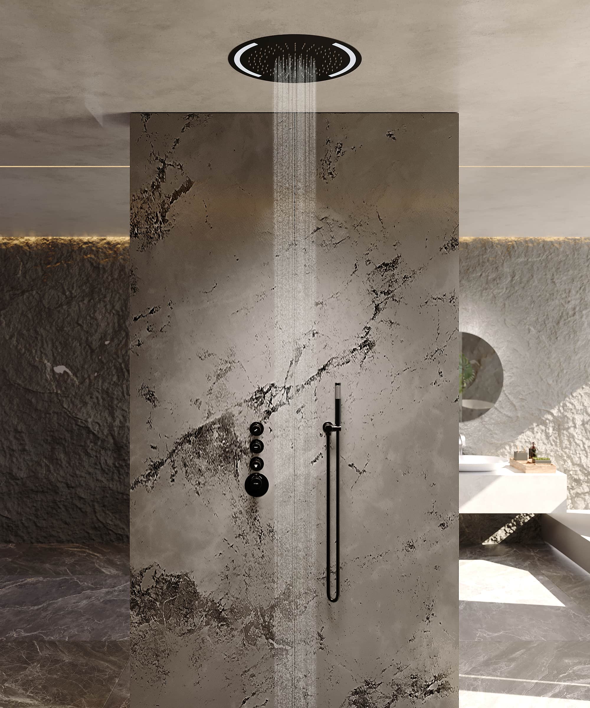 Il soffione a pioggia interpreta il piacere dell’acqua attraverso due esperienze sensoriali distinte – pioggia fine e pioggia intensa – che avvolgono il corpo secondo il desiderio del momento, dalla dolcezza più delicata all’intensità avvolgente. L’illuminazione a LED integrata si distingue come valore decorativo aggiunto: colori intercambiabili, regolabili tramite telecomando incluso, trasformano l’atmosfera luminosa e favoriscono una personalizzazione totale dello spazio doccia.