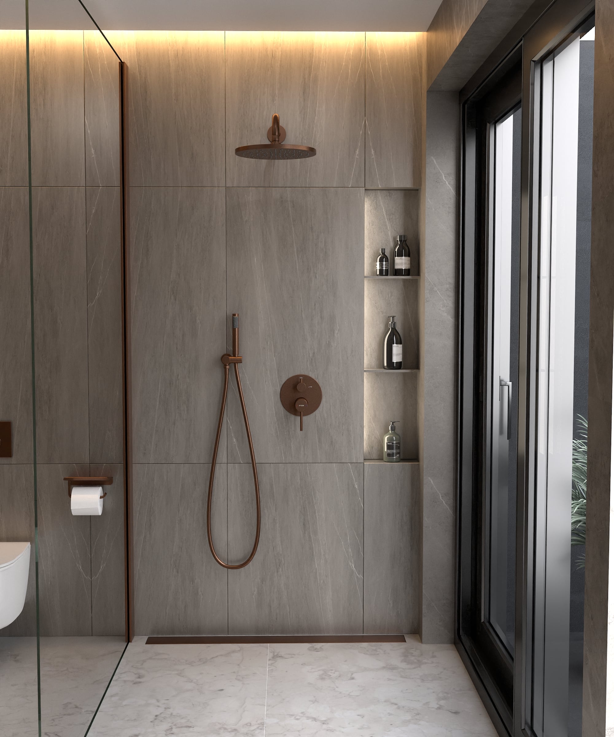 Con il kit doccia da incasso Corbeau in or rose brossé, la zona bagno si trasforma in un autentico scrigno di modernità, eleganza e funzionalità, pensato per offrire quotidianamente un’atmosfera di serenità e benessere senza tempo.