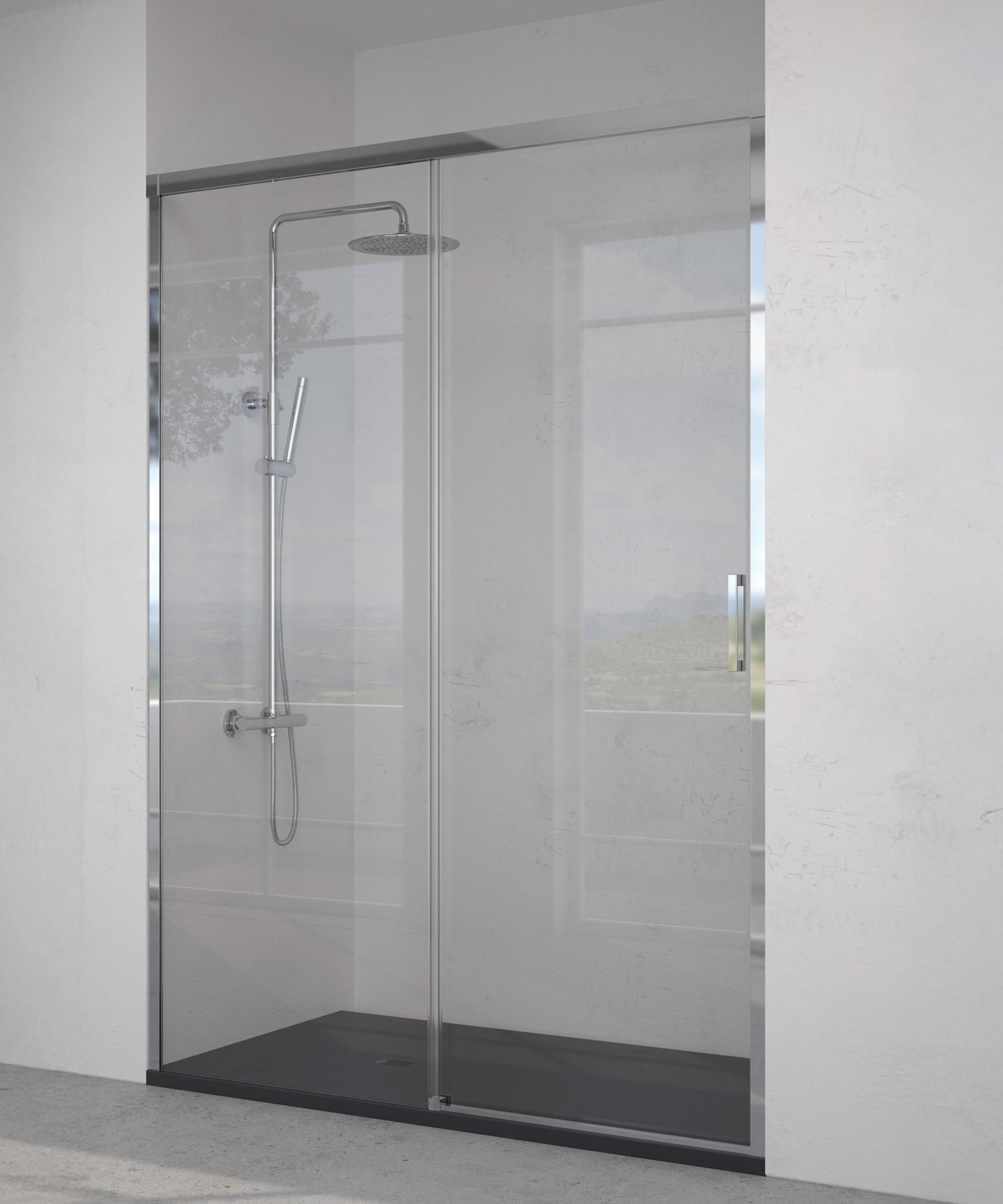 Lo schermo doccia fisso della gamma Q con porta scorrevole cromata unisce funzionalità e design. Grazie alla sua porta scorrevole, ottimizza lo spazio e offre una facile apertura grazie alla maniglia ergonomica e alle doppie rotelle. Il vetro temperato, rinomato per la sua robustezza, e i profili in alluminio garantiscono una lunga durata. Inoltre, il sistema anticalcare integrato facilita la manutenzione e riduce i tempi di pulizia.