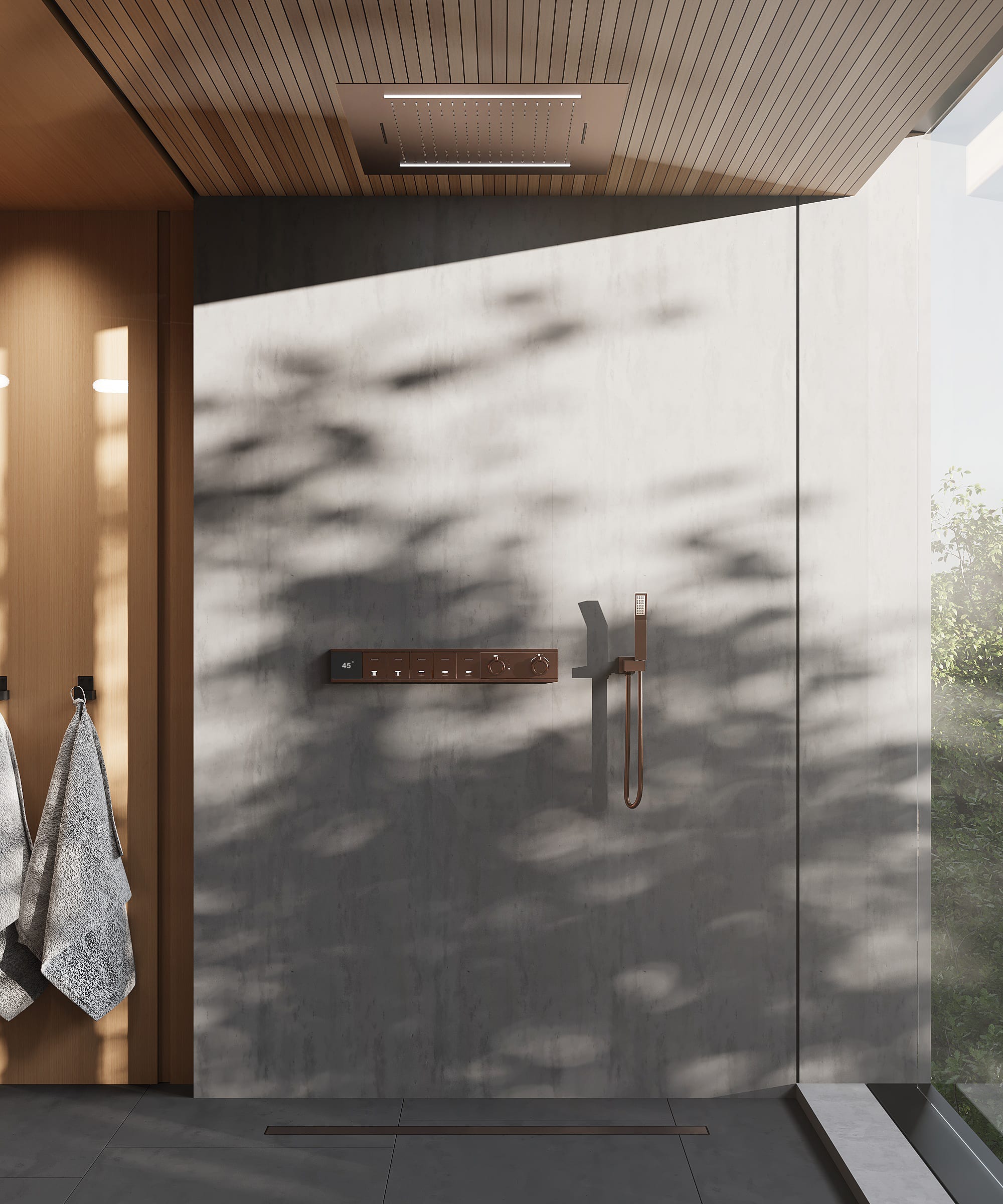 Il soffione a pioggia 70x70 cm offre tre getti distinti di pioggia e due getti cascata, per un’esperienza unica. Scegli tra pioggia fine rilassante, pioggia densa avvolgente o getto cascata rivitalizzante, attivabili singolarmente o insieme a seconda delle esigenze.