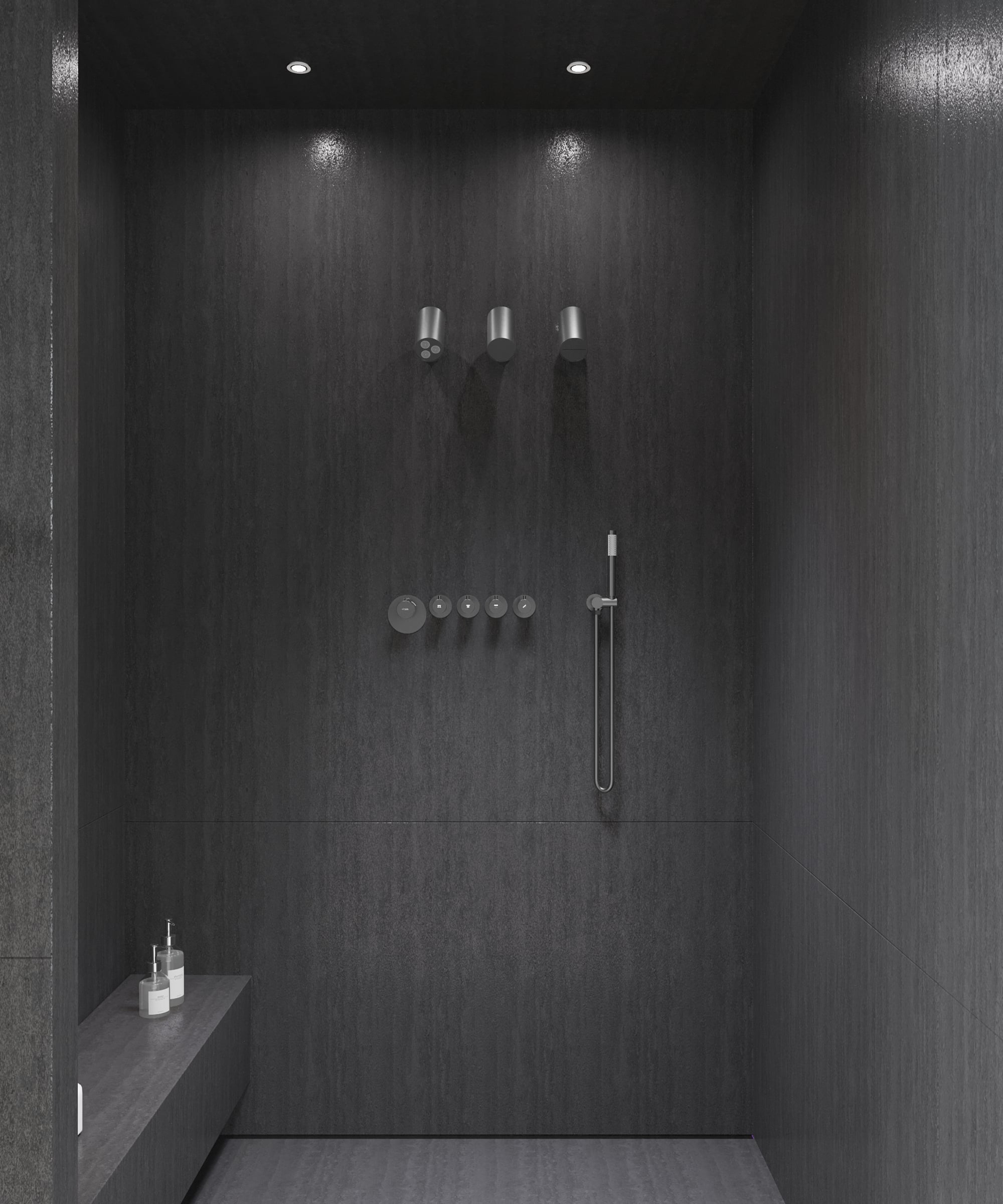 La raffinatezza dell’insieme si esprime attraverso tre soffioni a spot, espressione di un perfetto equilibrio tra eleganza formale e funzionalità contemporanea. La sottile finitura gun métal conferisce carattere e modernità, garantendo un’integrazione armoniosa negli ambienti bagno più attuali. Totalmente orientabili, ciascun soffione propone un getto distintivo, per modulare la piacevolezza delle sensazioni secondo il desiderio del momento: