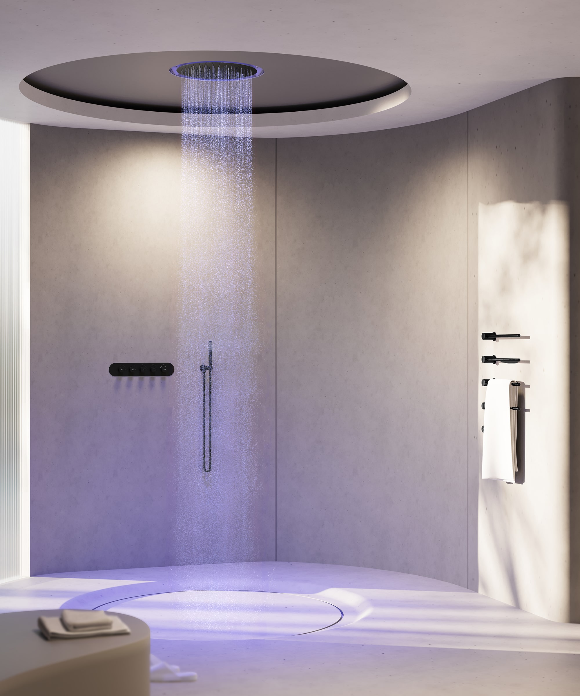 L’iconico soffione a pioggia si arricchisce di un bordo luminoso: tonalità modificabili tramite telecomando, per atmosfere ora rilassanti, ora rigeneranti. Il gioco di luce, in dialogo con la finitura nera, esalta i contrasti e sottolinea il carattere scultoreo del sistema, integrandosi con armonia agli ambienti bagno più esclusivi e raffinati.