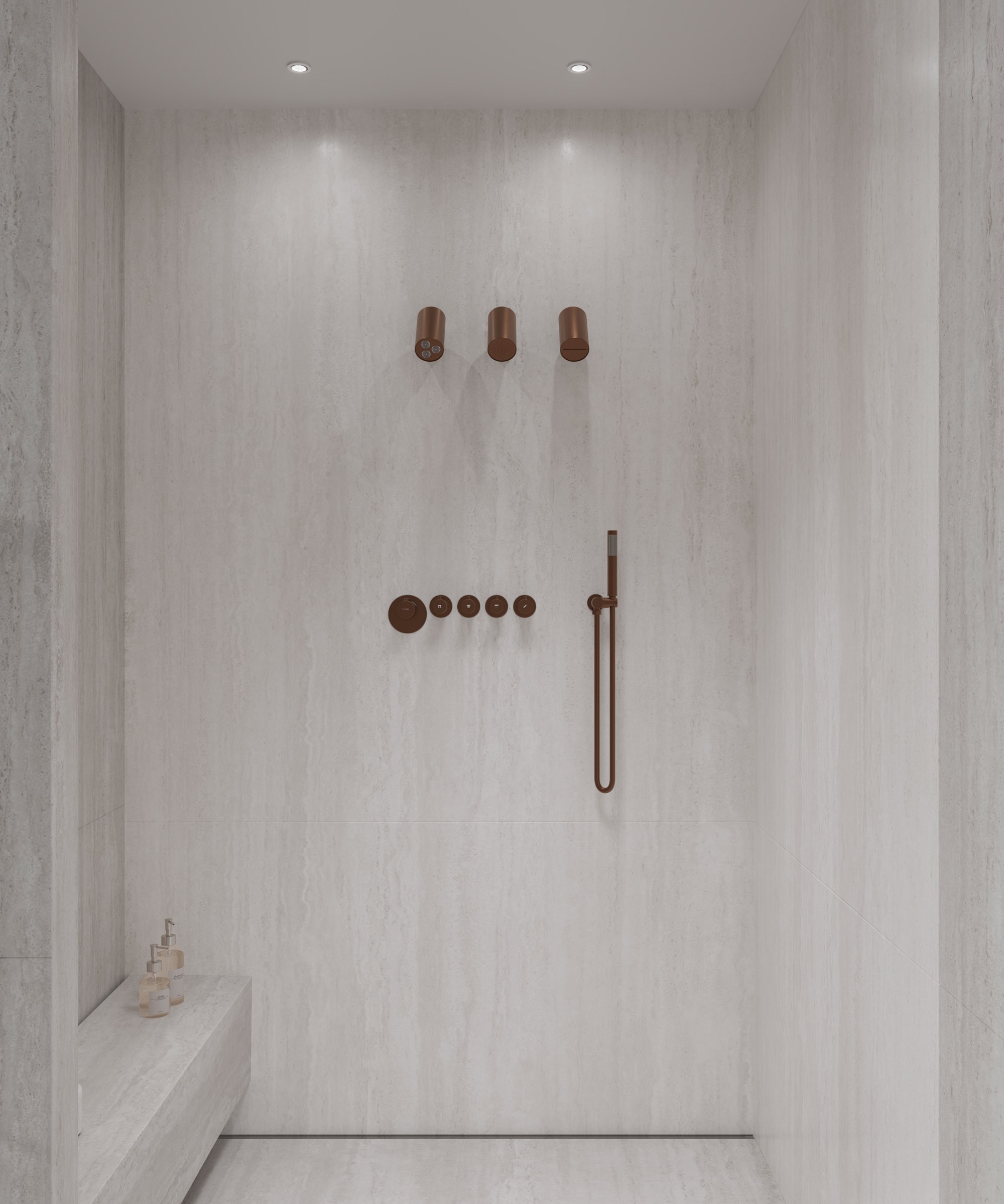 L’eleganza dell’insieme trova il suo fulcro nel miscelatore termostatico ad incasso (scatola dedicata inclusa), caratterizzato da un design purissimo. I comandi, valorizzati da pittogrammi intuitivi, permettono una regolazione precisa di portata e temperatura; la selezione dei diversi getti, individuale o simultanea, si adatta perfettamente alle esigenze personali, garantendo un’esperienza su misura.