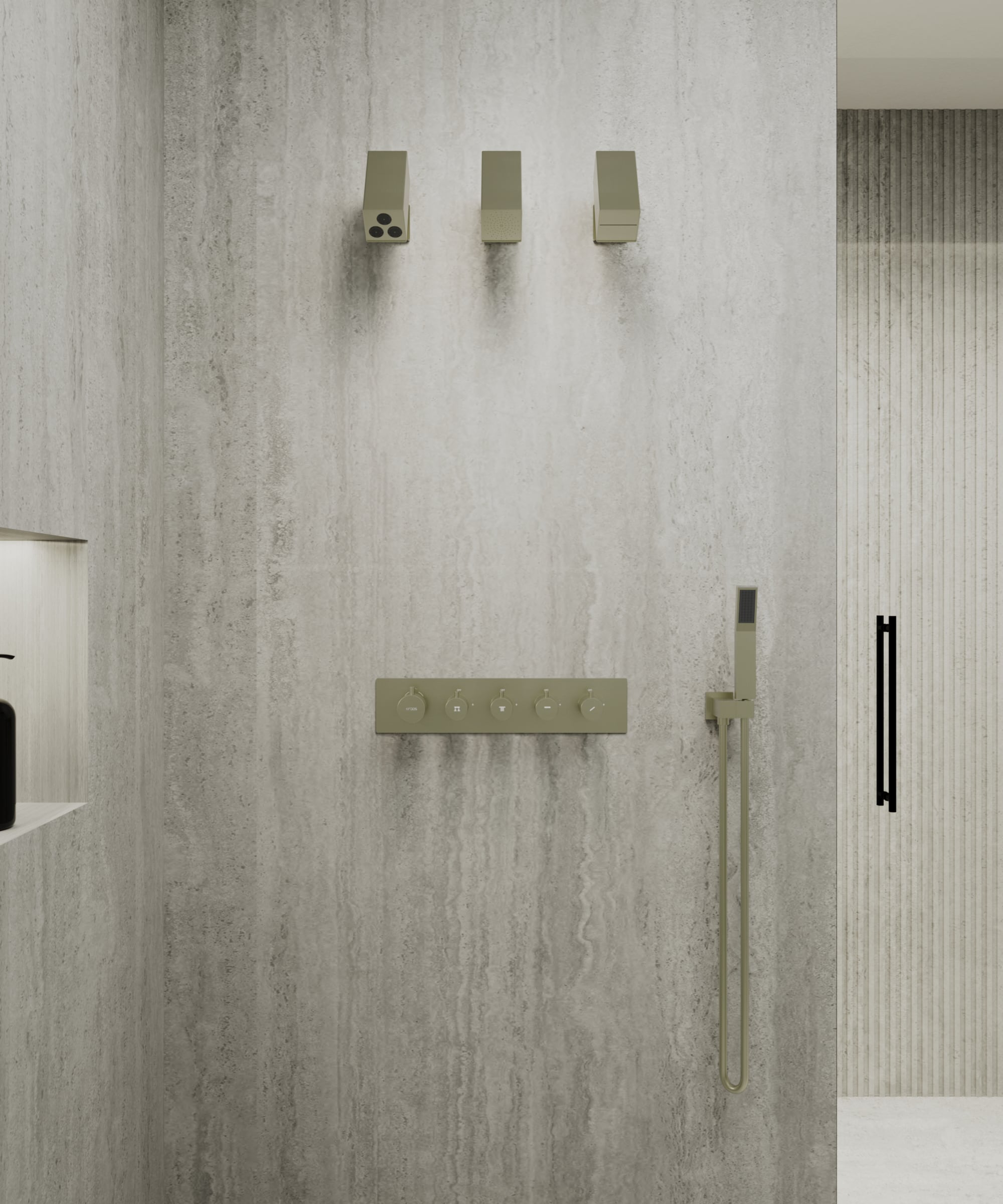 Pensata come soluzione integrale, questa composizione riunisce un miscelatore termostatico incassato a 4 funzioni, tre soffioni doccia orientabili e una doccetta a mano con flessibile in PVC, accompagnata dal supporto murale coordinato. Ogni elemento si distingue per la cura estrema riservata sia alla funzionalità che al disegno formale, evidenziando l’armonia tra le geometrie essenziali e la raffinatezza della finitura dorato spazzolato, che riflette la luce con discreta eleganza esaltando l’atmosfera dell’ambiente bagno.
