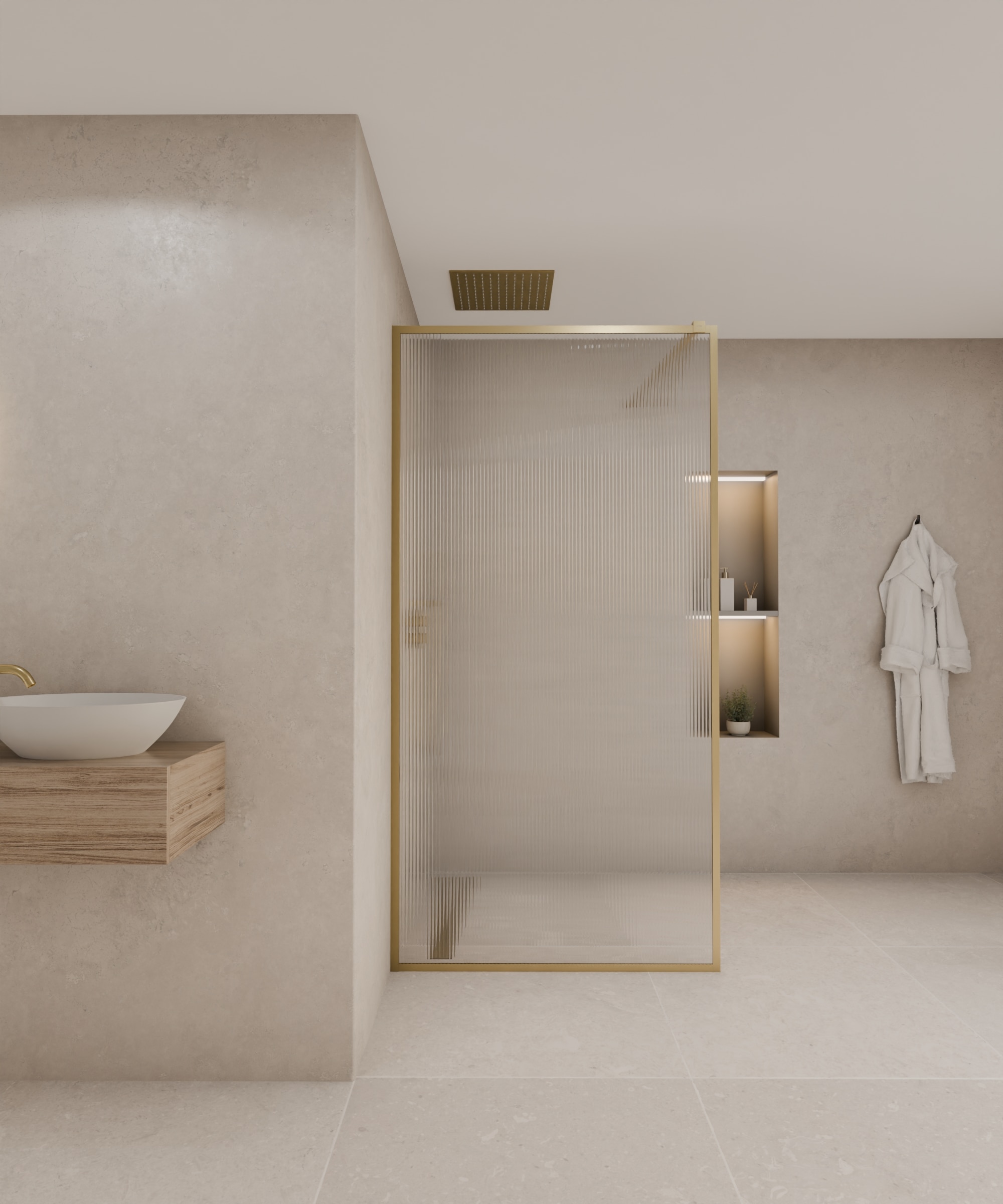 Lasciati conquistare dalla parete doccia oro spazzolato Sintra in vetro scanalato, che offre una texture elegante e riflessi discreti uniti a una splendida finitura morbida ed elegante, per un’atmosfera chic. Oltre alla sua estetica ricercata, questa parete doccia propone numerosi vantaggi: